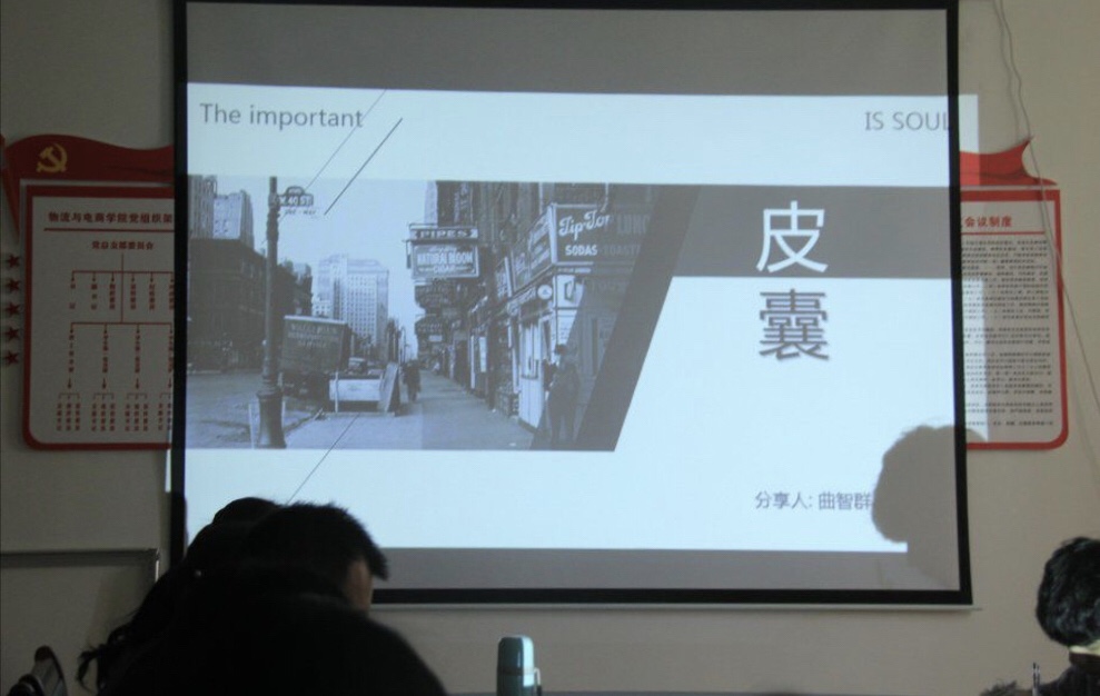 本期主讲人是18级办公室干事曲智群,她为大家分享的是受到众多名人作家联名推荐的书籍—《皮囊》。她主要从图书简介、内容介绍、视频分享与心得体会四个方面向大家讲解这本书的相关内容,并分享自己感想。首先,曲智群向大家讲到了《皮囊》的简介,通过她的介绍,大家了解到《皮囊》是一部有着小说阅读质感的散文集,书中收录了《皮囊》、《母亲的房子》、《回家》等14篇作品。在介绍完《皮囊》的简介之后,她又和大家分享了书中其它几篇作品。除此之外,曲智群还向大家分享了一段视频,视频中讲述了一位梦想破灭的年轻人,在经历过绝望之后,伪装成一位盲人帮助别人调钢琴,在盲人工作时他见到过各种各样的人,也获得了不一样的尊重,但视频的最后,却是以盲人遇到了杀人犯并被杀死为结局。她认为视频中人物们表现出的有皮囊时存在的伪装和无皮囊时灵魂的释放,与本书恰好相照应。