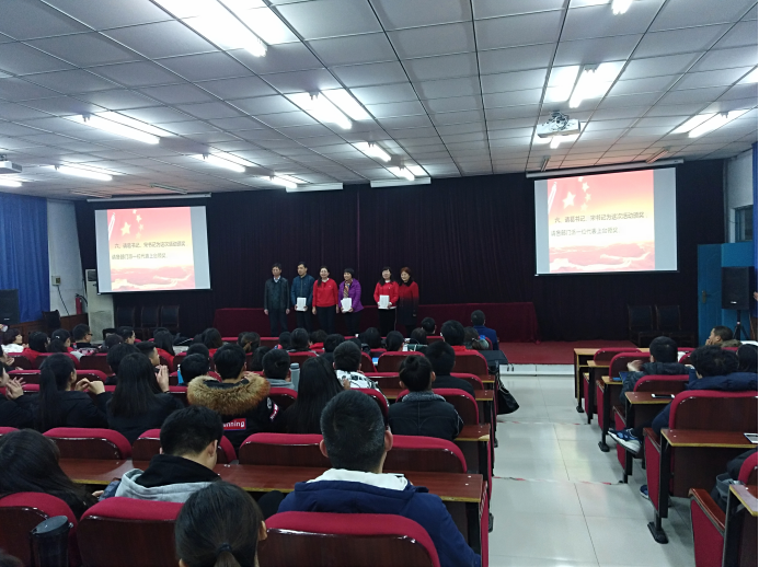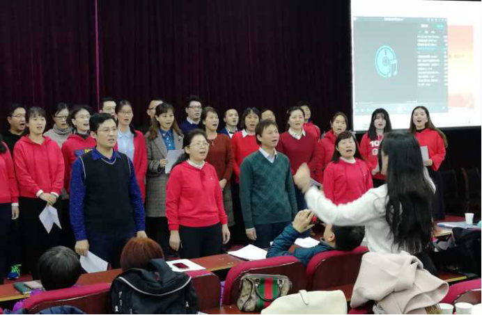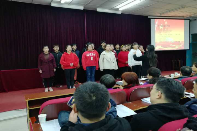 红歌会在全体与会人员的大合唱《没有共产党就没有新中国》中拉开帷幕。文法公司党总支书记葛丽娅致辞,她指出传承红色经典、开展红歌传唱活动,在高校育人工作中具有独特的价值和作用。红歌会在“唱红歌、比干劲”环节中精彩纷呈:物电公司员工合唱团的《走向复兴》演唱的气势恢宏,文法公司文星艺术团合唱队带来的《北京的金山上》、《唱支山歌给党听》真挚绵长。而理学部全体教师的《打靶归来》、文法公司师生的《同一首歌》、物电公司全体教工的《团结就是力量》不时赢得现场观众的热烈掌声。理学部副主任李春婉转悦耳的独唱《我爱你,中国》和物电公司温丹丹、陈梦莹、胡可鑫、殷猛等老师激情澎湃的诗朗诵《沁园春雪》一次次将现场气氛推向高潮。正如物电公司党总支书记宋之苓在总结讲话中所说,在毛泽东诞辰125周年来临之际,三院部师生共聚一堂传唱红歌,缅怀先烈的丰功伟绩和无私奉献精神,本身就是一次极有意义和价值的学习与交流。