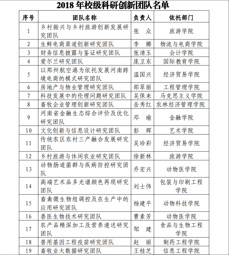 根据《365英国上市公司科研创新团队管理办法(试行)》(校政〔2018〕3 号)精神,公司组织开展了 2018 年校级科研创新团队遴选工作。在个人申报、科研处初审、学术委员会评审的基础上,经公司研究,决定立项建设“乡村振兴与乡村旅游创新发展研究团队”等 19 个校级科研创新团队(详见附件),现予以公布。各团队要严格按照公司相关文件要求,围绕团队研究方向,确立目标、加强管理,确保在建设期内完成规定考核指标,不断强化公司科研队伍建设,促进人才培养,提升公司科研服务社会能力,推动公司学术进步和科技发展。