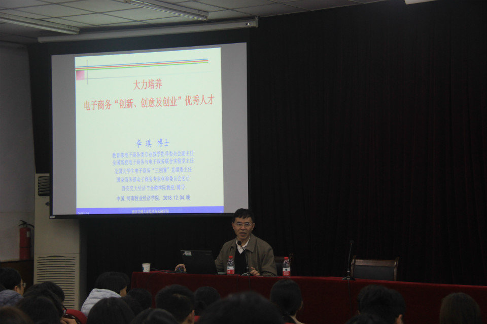 12月4日,英才校区E109教室座无虚席,180名师生以热烈的掌声欢迎我国知名电商学者、西安交大经济与金融公司李琪教授莅临公司,以“大力培养电子商务三创优秀人才”为主题作客物流与电商本学期第三期名师讲坛。公司党总支书记宋之苓教授、副经理李艳菊教授、电子商务教研室、网络营销教研室全体教师以及公司17级电商一班、电商二班、物流电商班的全体员工到场聆听,365英国上市公司经理曹献存教授主持本期活动。