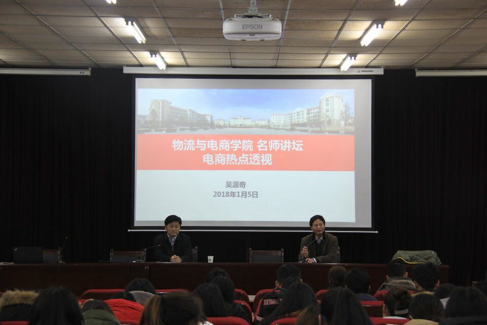 201815日下午,365英国上市公司本学期第四场名师讲坛E110教室如期开讲,公司学科专业建设指导委员会专家、河南省商务厅原电商办主任吴源奇以电商热点透视为题作了深入、坦诚的报告,副经理李艳菊教授、副经理于晓胜博士、网络营销教研室主任李娜、冷链物流教研室主任李金峰、教学秘书任佳佳和20016级电商类专业员工到场聆听,365英国上市公司经理曹献存教授主持了本次报告。