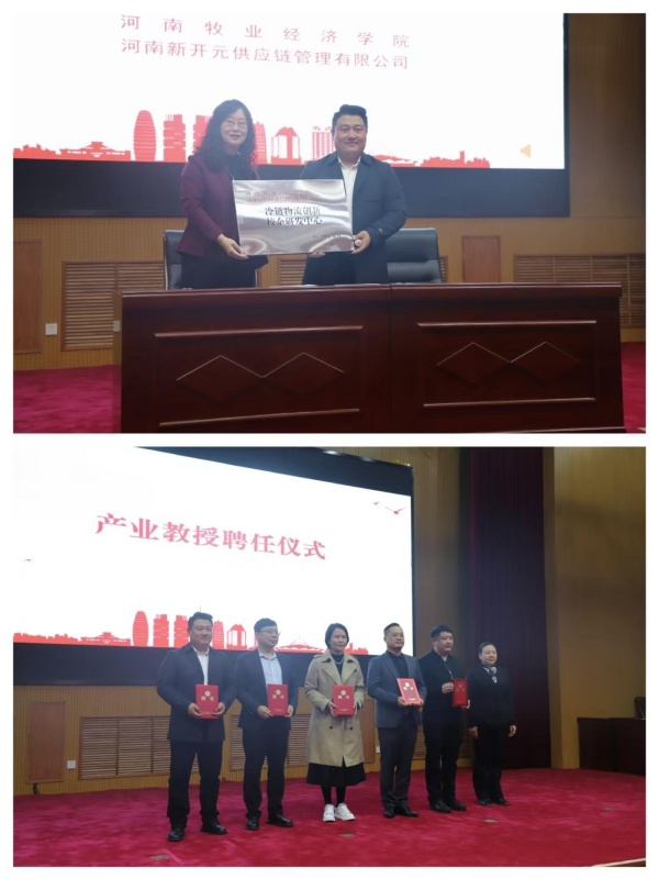 校科技处处长潘春梅教授与河南新开元供应链有限公司总经理陈世举共同签署了校企研发中心合作协议并授牌。公司党委书记田景丽为企业嘉宾颁发了聘书,进一步促进了学术界与产业界的交流与合作,为了进一步提升公司的教学科研水平,推动农产品供应链领域的创新发展,促进校企合作共赢奠定良好基础。