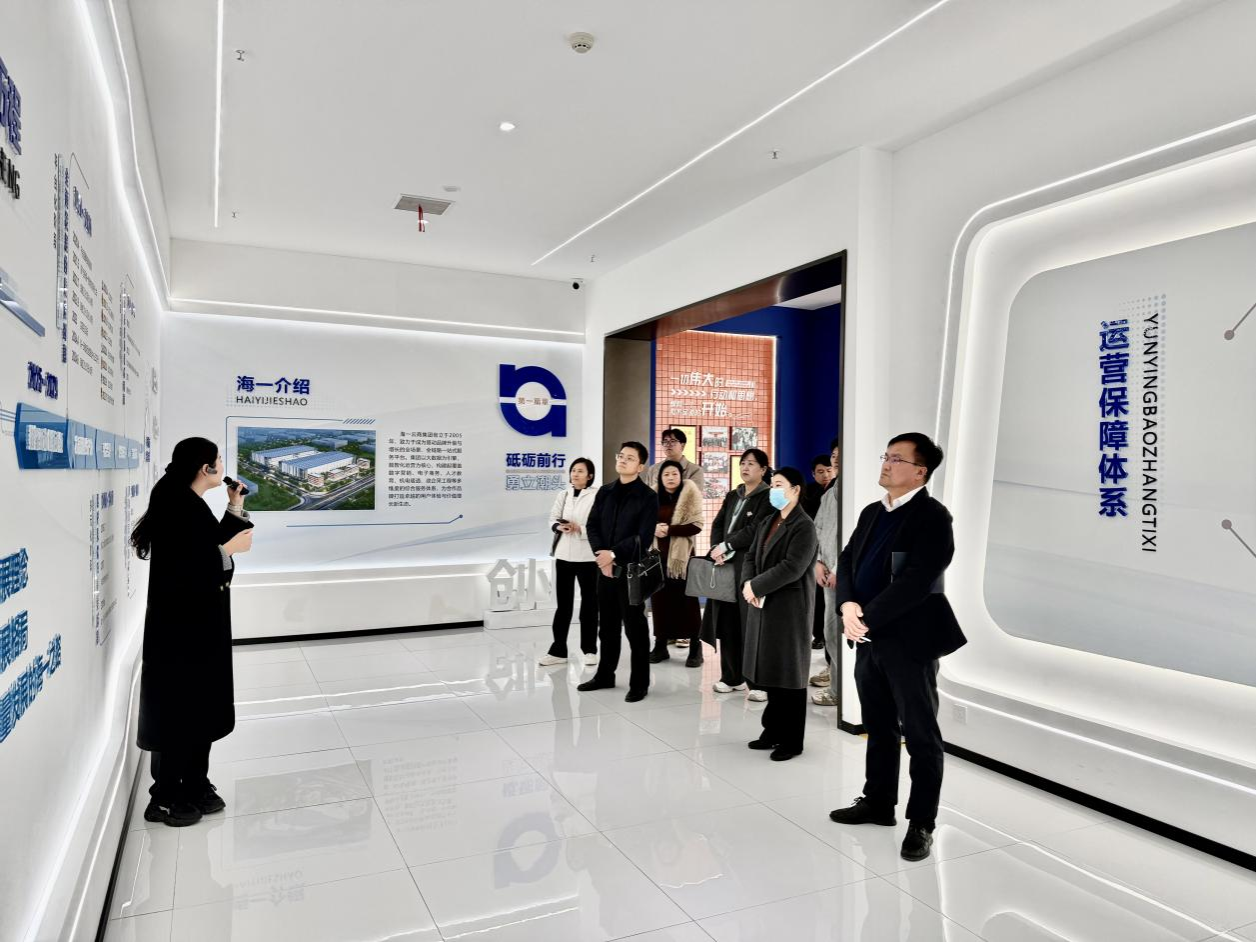 调研团队首先参观了海一云商海融汇办公区及直播间,实地了解企业在直播电商板块的运营模式与实操场景。随后,大家走进海一总部基地,进一步感受企业的发展规模与企业文化。据悉,经过二十年的持续发展,海一云商已成长为一家以郑州市二七区为总部基地,拥有八大办公园区、15万余平方米办公营业面积、线下直营店100余家、线上店铺800余个、直播间1100余间、员工6000余名的“直播电商航母”。