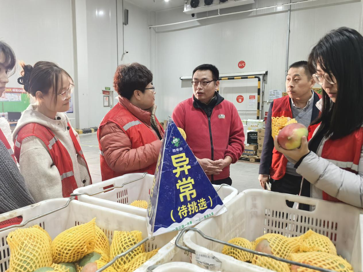 调研团队首先走进百果园专业检测站,实地观摩果品质量管控全流程。从农残快速检测、重金属含量筛查,到糖度精准测定、果面完整性检验,工作人员详细演示了每一项检测标准与操作规范,让师生直观感受百果园“不合格果品零入库”的严苛品控理念。随后,团队深入冷链仓储间,了解多温区差异化保鲜技术、智能仓储管理系统的应用场景,近距离观察各类果品的分类存储、保鲜养护细节;在中转分拣区,师生们见证了果品从分拣、打包到夜间发车的高效流转流程,对百果园“当日分拣、夜间配送、次日到店”的供应链闭环模式有了全面认知。