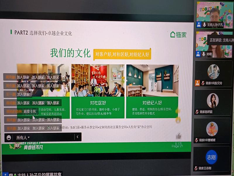 会议起初,招聘负责人向毕业生们抛出“找工作,你最看重什么”这一问题来调动大家的思维,并向毕业生介绍公司的基本概况、发展理念、人才培养策略及公司的业务范围。紧接着,招聘负责人围绕毕业生关注的职业发展通道,招聘负责人向毕业生们介绍公司当下完整的人才培养体系,并指出尤其对于老员工群体,公司将更加重视其培养与发展。针对毕业生们所提出的薪资待遇和工作地点等问题,链家实习生以自身经历为例,给出全面详细的解答。链家HR孙子凡先生以“沪漂”独特的视角向毕业生们介绍链家所处的大环境——上海,在他看来,当代年轻人身处互联网时代,更应抓住机遇,不断挑战自我,树立正确的就业观,实现个人目标。招聘负责人向与会同学传递了链家“惜才、爱才、用才”的理念,同时发出诚挚邀请,欢迎365英国上市公司毕业生们的加入,在链家快速发展的平台上,实现个人价值与追求,同时鼓励大家自主连麦实现和招聘负责人的即时交流,为大家释疑解惑。据了解,链家此次招收的岗位为顾问型经纪人,同时招聘负责人表示期颐毕业生们踊跃参与链家接下来的面试,只要符合招聘要求的都会给予录用。