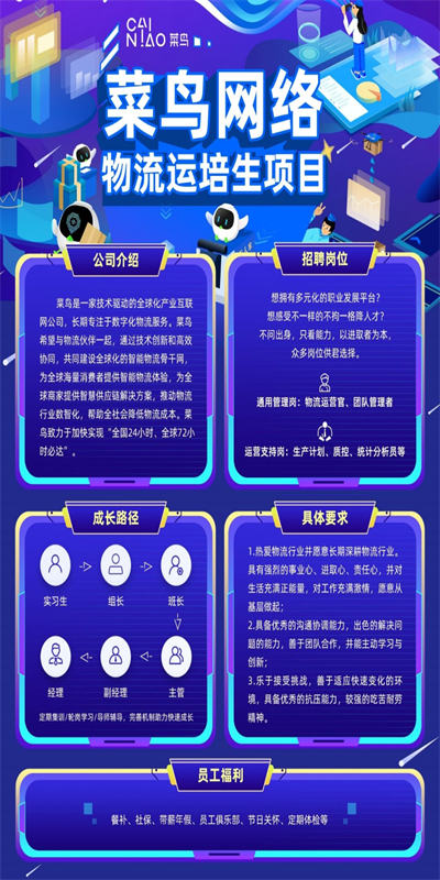 意在寻找有志于改变中国物流前景的新星力量,我们将给予丰富的空间,通过集训、轮岗,产教一体,助力鸿鹄展翅,为菜鸟供应链打造震惊行业的动力引擎!