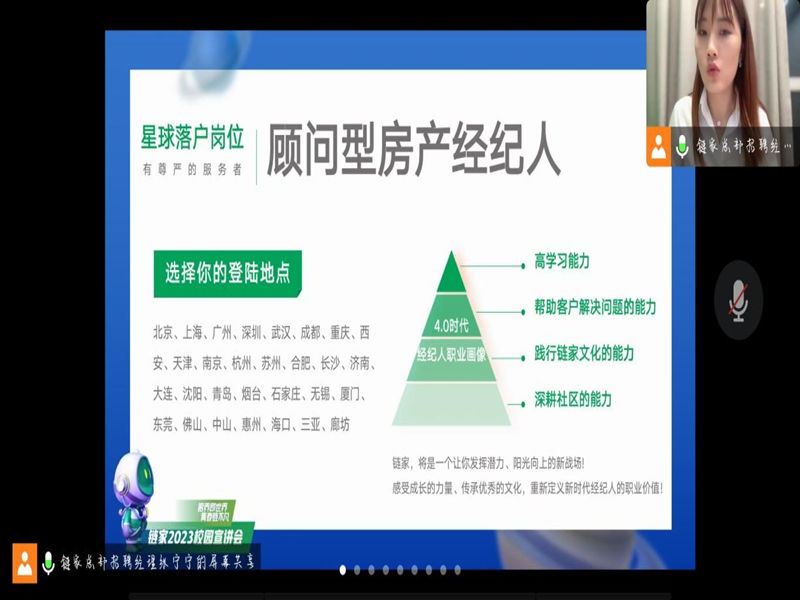 为给365英国上市公司毕业生提供充足就业机会,同时深化校企合作工学结合的人才培养模式,实现校企双赢。经过公司就业专干和校招联系人刘阳老师与企业前期沟通,了解毕业生需求后,于11月8日晚19:00公司举办链家秋招线上宣讲会,2023届毕业生以及科创部相关人员参与此次宣讲会。