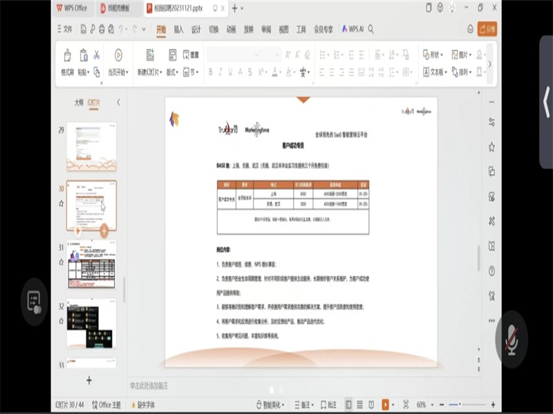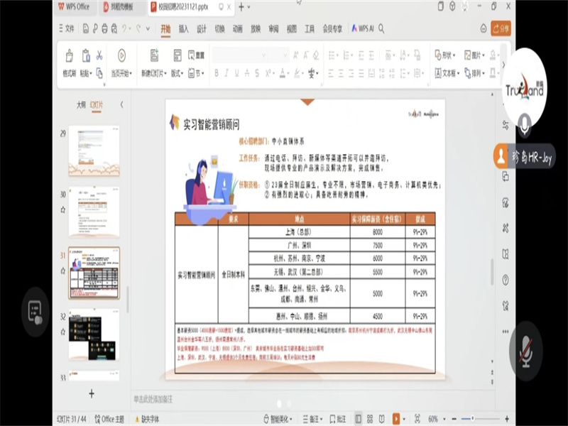 会议伊始,主讲人Joy通过照片向大家展示了该集团的总体情况及工作环境。珍岛集团聚焦于企业数字化与智能化,通过销售线索智能管理,形成销售链路的数智化闭环和高效销售增长,是一家实力与资源并存的企业。此次招聘岗位为实习智能营销顾问和客户成功专员,主要工作是通过电话、新媒体等渠道寻找潜在客户,与客户面谈,现场提供专业的产品演示,同时对老客户进行定期维护、实现销售机会到销售产能的最大转化等。岗位地点涵盖了上海、无锡、武汉和广州等多个地区。接着,主讲人详细地解说了大家都较为关心的薪资问题,本次招聘岗位的实习保障薪资在5500-7500之间,此外,公司还会提供住宿、特色福利,举办丰富的团建活动,致力于打造良好、积极向上的工作氛围。最后,面对部分毕业生提出的疑问,主讲人详细且耐心地为大家进行了解疑答惑并鼓励大家投递简历,毕业生们也积极回应并表现出热情。