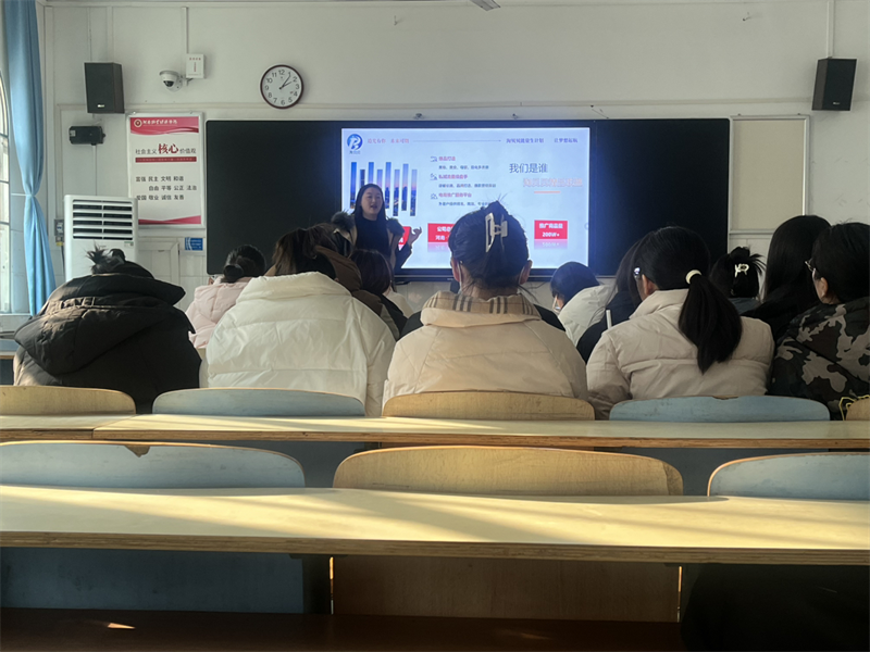 会议开始之前,企业招聘负责人给在场的毕业生发放了企业宣传页,帮助毕业生对该企业有一个大致的了解。接着,主讲人伯乐爱以PPT的形式展示了企业的相关信息及岗位介绍。淘贝贝是河南郑州的一家本土企业,多年来一直致力于电商领域,具备年轻化有活力的工作团队、完善的培训晋升机制和优渥的福利待遇。此次的招聘岗位为电商推广和渠道维护,主要包括与各商家负责人对接工作、进行流量渠道开发和产品营销等,工作地点在郑州市高新区电子商务园区。薪资方面,毕业生在实习期间可得到每月无责底薪4000左右,转正之后为5200每月加提成,同时享有六险一金、带薪年假、内推奖、创新奖等福利。员工们在宣讲会期间表现出极大的兴趣并与主讲人积极互动。会议最后进行了互动问答环节,伯乐爱女士耐心回答了毕业生的疑问并鼓励他们投递简历,随后在现场进行了面试。