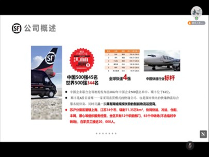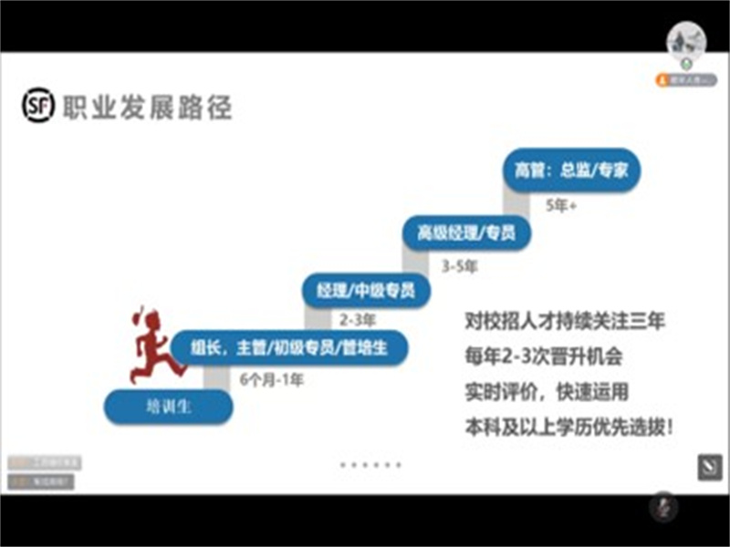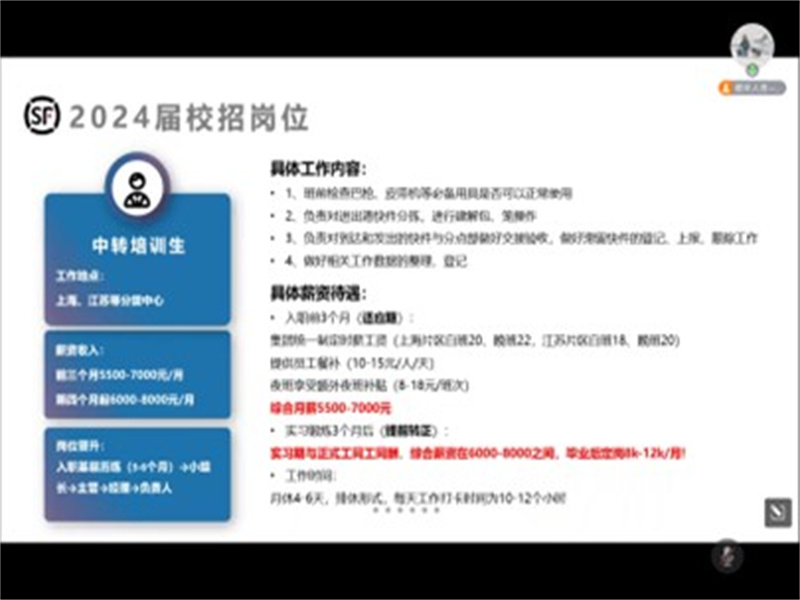 宣讲会正式开始前,顺丰集团苏沪分区招聘负责人何先生首先为同学们简单介绍了顺丰集团的发展史,顺丰集团创立于1993年,发展迅速,于2017年借壳上市,2019年营业收入破千亿,同时向大家详细介绍了顺丰集团的公司文化。本次招聘岗位主要职位是中转培训生,主要负责苏沪地区中转场的快递包裹流转工作,应聘者通过3-6个月的实习期后将定岗定薪定职,此后可通过三条晋升通道实现职位提升,实习期内薪资约5500-7000元/月,三个月后定岗定薪(6000-8000元以上/月),工作地址在苏沪分区,由于其优越的地理位置以及较高的经济发展水平,在顺丰全国分区中占据重要地位,其拥有最先进的物流体系科技,完善的三网体系,并将在未来逐步向智能化转型。提供免费住宿,员工餐补,毕业后缴纳社保。最后,负责人提到校招与社招的区别,校招的录取几率更高,且晋升空间更大,机会也更多,鼓励同学们积极参加校招,并针对同学们的疑问作出解答,引导有意向者扫码填表,开始线上面试。至此,本次宣讲会圆满落幕。