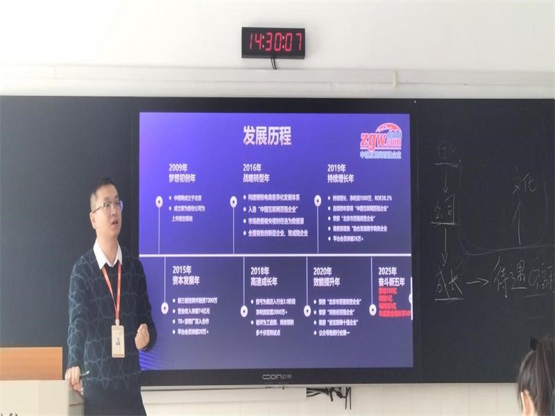 宣讲会正式开始前,主讲人贾经理为同学们播放了企业的宣传片,初步向同学们介绍了中钢网的相关信息。会议正式开始,贾经理针对同学们最关注的问题引导同学们思考如何找到一份适合、满意的工作,要从行业前景、公司、成长、福利待遇、公司文化等方面进行全方位了解,以此帮助同学们更加明确自己的就业目标。然后,贾经理详细地向同学们介绍了中钢网的发展历程、定位理念、人才培养模式、福利待遇等。中钢网作为一个互联网百强企业,拥有着丰富的企业文化,更是在疫情的逆势下实现了新的跨越。本次招聘的岗位主要有:新零售专员、文艺发言人(主播等)、管培生,薪资待遇优厚,福利包括有六险一金、孝慈津贴、生日会、节日福利、带薪年假、法定节假日、免费住宿和班车等,除此之外,公司设有大爱基金会用以帮助家庭经济十分困难的员工。最后,贾经理及另外三位招聘人员分别分享了自己在公司的发展情况,并针对同学们的疑问作出解答,在会议的最后,引导有意向的毕业生登记填表,并在现场进行了面试。至此,本次宣讲会圆满落幕。