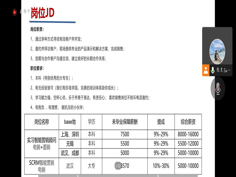 会议起初,珍岛集团主持人陈昊对珍岛集团的工作环境进行了介绍,公司环境整洁舒适,氛围融洽。随后,主持人陈昊对公司进行了详细介绍,珍岛集团总部位于上海,全国20多家分子公司,专注于数字营销技术、产品、服务、资源的创新与整合,致力于打造全球领先的SaaS 智能营销云平台。通过以上介绍毕业生们更加深入地了解了珍岛集团。本次宣讲会招聘实习智能营销顾问,主要负责通过多种方式寻找有效客户;定期与合作客户沟通交流等。工作地点在上海、深圳、无锡、武汉和成都等地。上海、深圳未毕业保障薪酬7500,综合薪资8000-16000。无锡未毕业保障薪酬5500,综合薪资5500-12000。武汉、成都未毕业保障薪酬5000,综合薪资5000-1000。入职人员享有各种现金奖励、五险一金、提供住宿、节日福利、法定假日、终身免费培训等多项福利,晋升机会丰富。最后,主持人陈昊对多位毕业生提出的问题进行答疑。通过问疑环节,让公司毕业生对企业工作有了更为全面的认识。