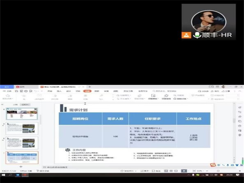 会议起初,顺丰招聘负责人首先通过PPT简单介绍了顺丰的发展历程,说明当前顺丰在国内国际的优势地位。随后,招聘负责人说明了顺丰目前经营的物流、金融、商业等方面的服务,顺丰始终贯彻基于物流、融通金融、流通商业的服务原则。顺丰所提供的高质量物流服务以及延伸至价值链前端的产、供、销、配等服务环节,与公司物流管理、电子商务等专业高度契合,公司毕业生能够迅速进入工作状态,为个人增值。负责人表示本次招聘100名现场运作储备干部,在年龄、学历、个人能力等方面作了具体要求,工作地点主要在上海市、江苏省、浙江省等地。负责人详细讲述了现场运作储备干部的工作内容:协助现场管理人员的日常管理;处理快件的分拣和扫描,跟进快件全流程;协调上下级人员流、信息流、资金流的顺畅流转;管理日常场地物业、物资、行政事务;场地各类费用核销、报销等财务类工作;对上级平级沟通,做好外包商对接及管理;跨境国际件处理等营运支持工作。入职员工享有五险一金,法定节假日,节日关怀等福利,实习薪资薪酬福利丰厚。负责人引导实习员工可通过运行、中控、营运、车管四条通道发展,结合员工自身优势灵活调整,可使企业与个人实现双倍增值。负责人通过PPT展示了公司办公环境,仓储工作环境,住宿环境等,毕业生们可以在公司享受到优厚待遇。招聘负责人鼓励毕业生们积极报名参与面试,并表示只要符合招聘要求的都会予以录用。