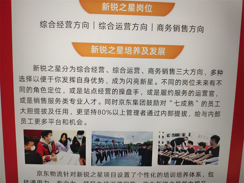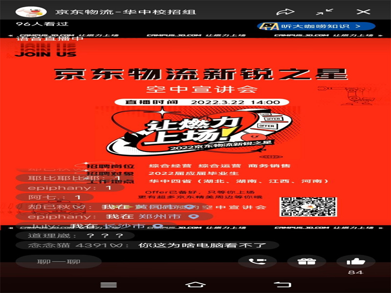 会议伊始,宣讲人员景老师与王老师进行自我介绍,讲述自己在京东物流的工作经历并表达新锐之星计划是为京东物流培养高素质人才,有极好的成长空间。随后景老师播放京东物流新锐之星计划宣传PPT,详细介绍了京东物流的企业文化,王老师又对京东物流的规章制度、福利待遇、产业结构、组织构架、人力资源政策等几个方面向同学们进行了简单的介绍,同时指出此次新锐之星招聘分为综合经营、综合运营、商务销售三大方向,工作地点在湖北、湖南、江西、河南四省,交代了线上招聘流程并现场解答了同学们的疑问。毕业生们积极参加此次宣讲会,有一百多人参与观看。最后,二人代表京东物流华中地区真诚的邀请公司同学加入京东物流新锐之星计划从而实现自己的梦想!