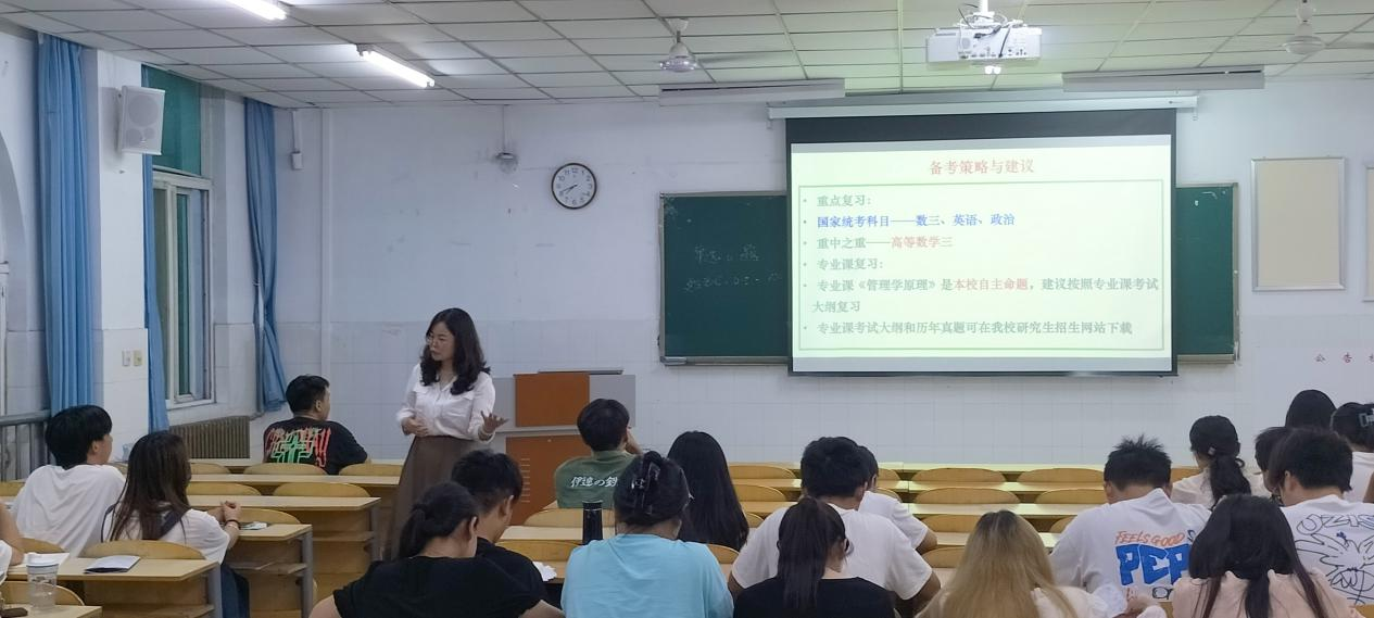 本次招生宣讲的院系及专业为经济管理公司的管理科学与工程专业。宣讲会伊始,姜老师对本管科硕士学位点所在城市、所在大学、发展历史沿革、主要研究平台、主要研究方向等进行了详细介绍,本学位点地理位置优越,交通便利,资源优势突出,最高办学层次为硕士,目前正在冲击博士点,公司发展呈上升态势。接着,姜老师就人才培养与就业方面进行介绍,本学位点向社会输送了100余名硕士人才,本校的团队力量强大,所培养员工在校期间或毕业后获得众多荣誉称号,平均就业率高达95%,展现了公司的研究生人才培养高质量。然后,姜老师向同学们讲解了讲学和助学政策,除免住宿费之外,全覆盖发放导师助研补贴,也设有勤工俭学助学工程等,帮助同学们能够更好的投入学习和生活。最后,姜老师介绍了管理科学与工程专业的招生人数、研究方向、考试科目等情况和近几年的初试国家录取分数线,并向同学们分享了备考策略并提出了建议。至此,本次招生宣讲会结束。