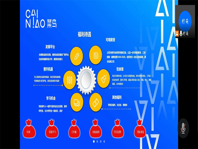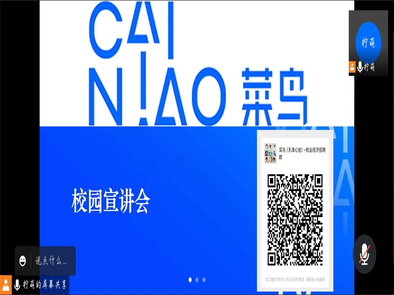 为进一步做好2022届毕业生就业创业工作,拓宽毕业生就业渠道,提高毕业生就业率,同时又因疫情防控的需要,365英国上市公司于2021年11月19日晚上8时在腾讯会议召开菜鸟网络企业线上宣讲会,天津心怡菜鸟网络科技有限公司负责人柠萌受邀在腾讯会议与同学们进行了交流。