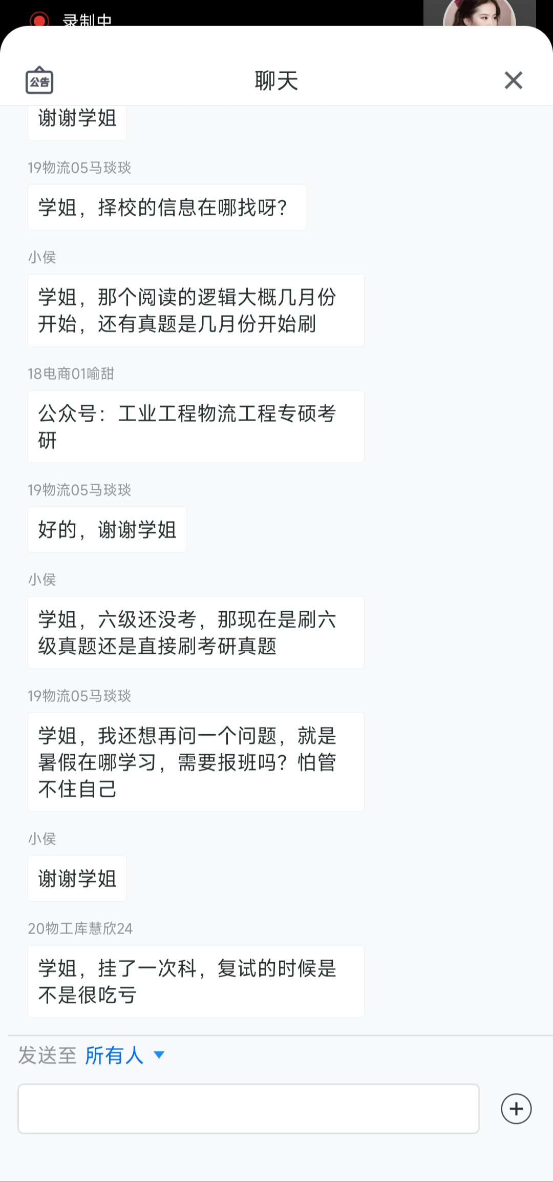 讲座开始前刘阳老师分析了当前的考研形势,分别介绍了参加本次经验分享讲座的三位同学,对参加的同学表示了欢迎和感谢,同时表达了对考研学子的鼓舞和期望。随后,由考入武汉科技大学物流工程与管理专业的朱琳同学进行分享。朱琳同学认为对考研学子来说,做出适合自己的选择是重中之重,无论是选择院校还是专业,都要做好对自己的认知和对公司、专业的了解。其次,分享了自己在考研过程中积累的经验和方法,同时强调高效的方法、沉稳的心态和持续的勤奋至关重要。接着,考入北京工商大学物流工程与管理专业的彭诗佳同学针对考研的科目和题型,为大家分享了自己在考研中使用的学习软件和学习资料,并把学习各种题型的见解和方法进行了详细的讲解,其中着重强调要多刷考研真题,培养做题手感。最后,考入浙江万里公司物流工程与管理专业的喻甜同学通过讲述自己的考研经历,全面地向大家分享了考研经验,首先讲明了选择考研公司和专业的重要性,随后推荐了各学科的考研资料和课程,最后介绍了浙江万里公司的复试内容,使大家对考研内容和形式有了更加全面的认识。三位同学分享结束后,进行了答疑环节,积极对同学们提出的问题进行了详细解答。比如有同学提出“该如何合理规划时间”这一问题,朱琳同学建议要把时间分为暑假前、暑假中和暑假后,目前要打好基础,暑假中要强化对知识的掌握,暑假后进行模考等。