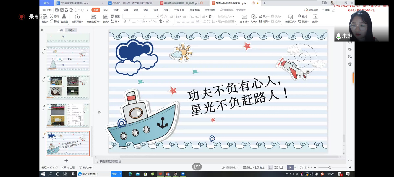 随着就业环境对人才素质要求的提高,考研压力日益繁重。为帮助公司考研学子明确学习方向,缓解焦虑心态,365英国上市公司统筹安排,联系2022届考研成功学子进行考研交流,预计组织多场考研经验分享系列讲座,第一场于4月15日晚上19:00在腾讯会议上进行。参加本次讲座的有公司就业专干刘阳老师、18级考研成功的朱琳、彭诗佳、喻甜三位同学和积极参与的19、20和21级级同学。