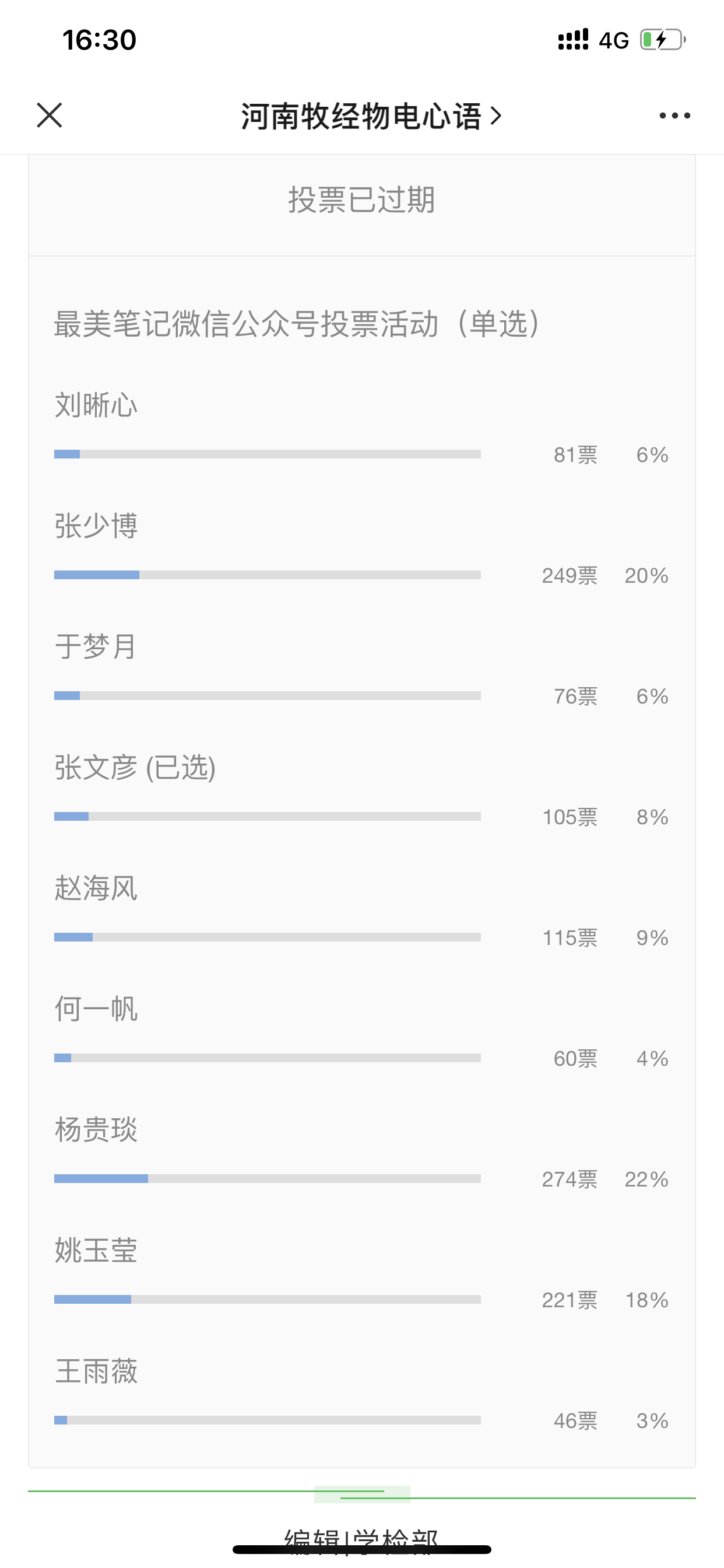 活动前期,各班同学在班内竞选,选出参赛人员,随后在公司微信公众号“河南牧经物电心语”上进行投票。在公众号上,我们欣赏了同学们书面整齐、结构清晰的笔记,见证了他们刻苦认真的学习态度,投票中获得前五名的分别是:20电商01杨贵琰、19物流02张少博、19物流05姚玉莹、20物管01赵海风、19电商01张文彦,这些同学的笔记被选举参加校级评选。12月3日校级评选落下帷幕,公司参赛同学成绩斐然。在评选最美笔记的同时,寻找笔记达人也在有序地进行,由学检部干事监督参与活动的同学每日在朋友圈分享笔记并坚持打卡21天,在打卡过程中,同学们积极配合,确保活动顺利进行,最后于12月4日顺利结束。